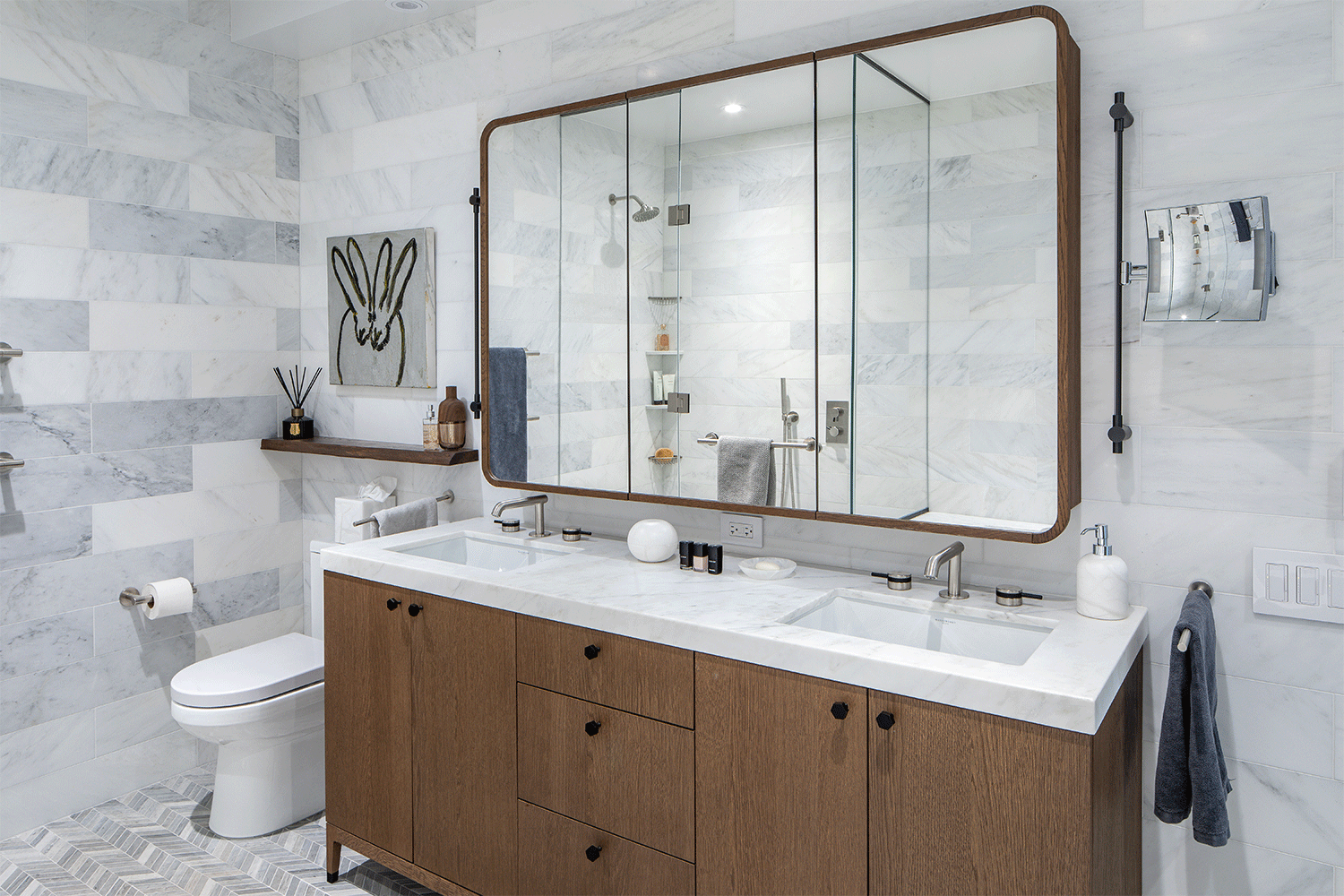 To maximize storage, plenty of cabinets were added in the kitchen under the island for pots and pans, and a custom bar to help hold more glassware and allow entertaining with ease. They also commissioned custom master bath and bedroom storage units, as well as one in the living room, to house the TV and some decorative items, as well as lower storage. The tub in the powder room was removed to create another closet, again using the space wherever possible. A beautiful custom bath was designed with a tub and glass shower unit, creating a spacious and luxurious appeal.