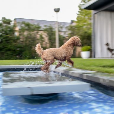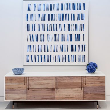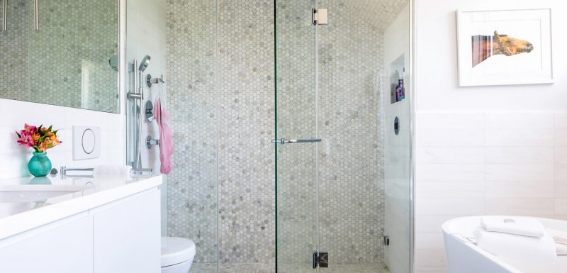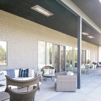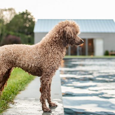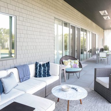 The finishes were all based on my love for Pelle Grigio – my stone inspiration throughout, with greys and whites; then the floors followed, and the fabrics and rugs from there. The special areas are the covered outdoor spaces, with outdoor drapery, lots of comfortable seating, outdoor rugs, and every hospitality with heaters built into the ceilings, overlooking the pool, with a shallow space for our poodles, or for just sitting and lounging.