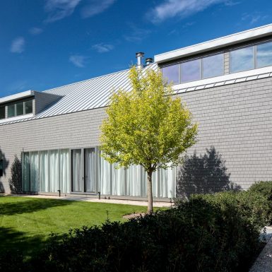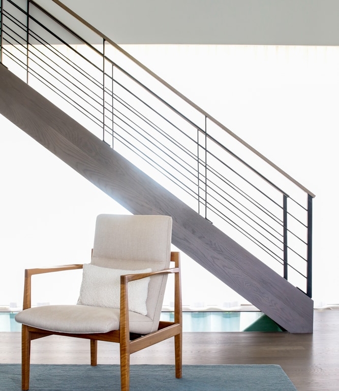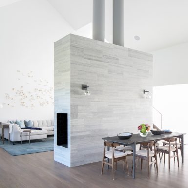 We started with that in mind and designed from there. Once we established the standing seam roof shape and the expanse of glass across the front and the back, the rest was easy. We floated the fireplace wall in the center of the room, leaving lots of space above for the 25-foot ceilings above.